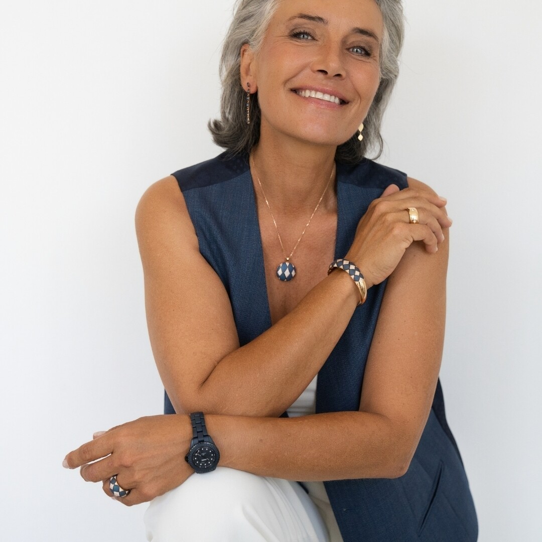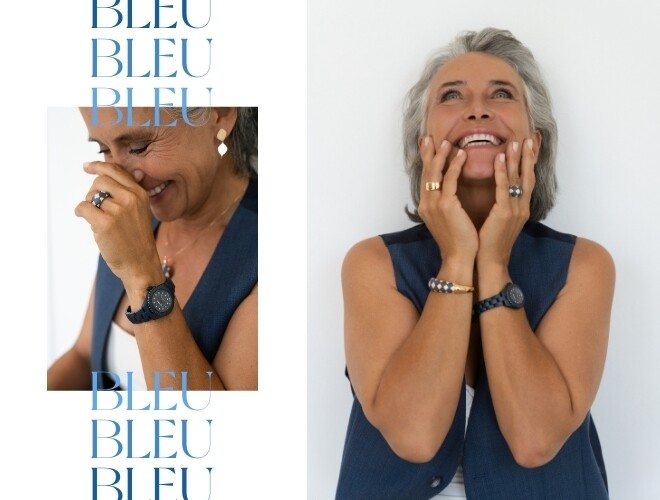 La J12 Bleu se décline dans différentes finitions. Comme notre parure Arlequin qui se compose d’une bague, d’un pendentif et d’un jonc bleu, et existe également en gris. Des pièces singulières à porter avec allure, comme Catherine ; pour une beauté intemporelle…
