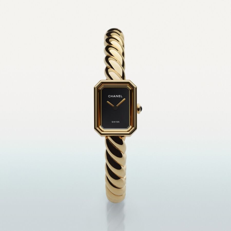 En 2025, PREMIÈRE emprunte au vestiaire de CHANEL l’un de ses éléments d’identification les plus emblématiques, le galon. Gabrielle Chanel l’applique sur ses tailleurs pour en souligner les contours, orner les poches et les poignets et structure ainsi la silhouette. Reprenant les couleurs du tailleur, ou contrasté pour un effet graphique, le galon de couture est réalisé dans une grande variété de matières et de techniques (tricoté, tissé, torsadé). Grâce à PREMIÈRE GALON, la montre PREMIÈRE réinterprète l’un des éléments signature de CHANEL. Le bracelet de PREMIÈRE GALON est un jonc rigide constitué d’un galon torsadé qui offre un nouveau porté. Raffiné, ce bracelet en or jaune 18 carats fait ressortir la pureté du cadran laqué de noir exempt d’index. Et parce qu’il existe autant de galons que de versions du tailleur CHANEL, PREMIÈRE GALON se décline aussi en deux modèles ornés de diamants. En conservant son esprit résolument couture, la montre PREMIÈRE explore le territoire joaillier et s’habille d’un éclat précieux.