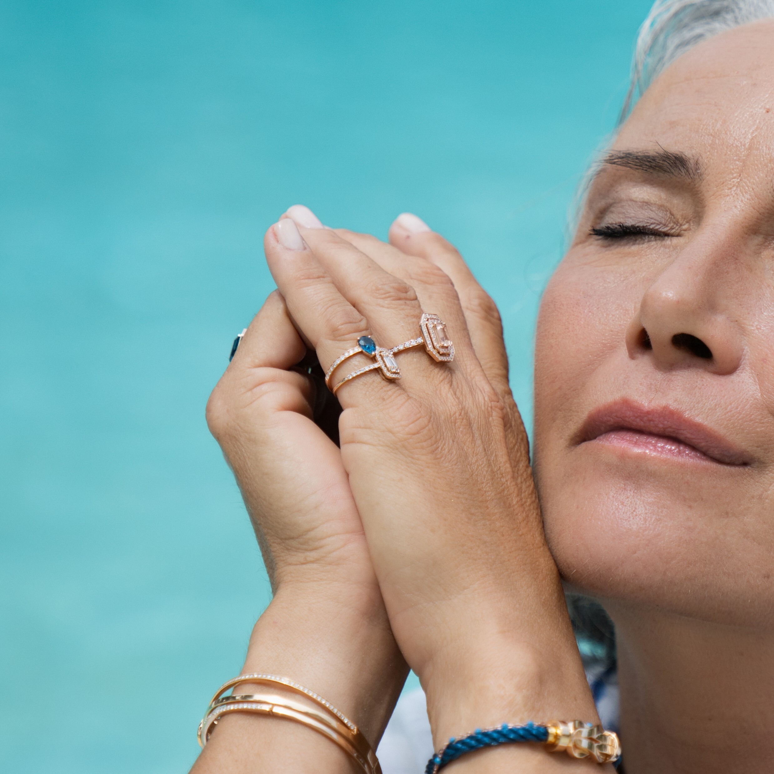 Bague Veron Roques Nuit d'Eté en or rose, topaze Blue London et diamants